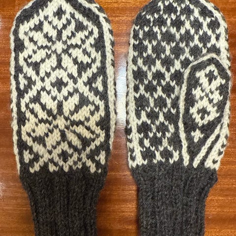Håndstrikkede votter laget av ull i grå og hvit farge. Vottene har tradisjonelt mønster og ribbestrikket mansjett. Passer til kalde værforhold. Str. L 30X11cm.