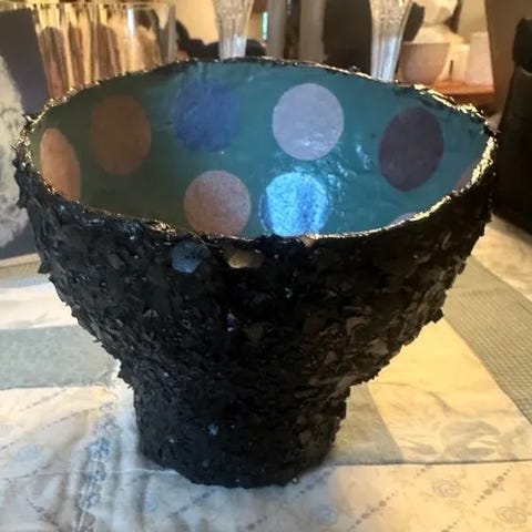 Utsiden er rå og sort, med grov struktur som gir en nesten vulkansk overflate. Denne kontrasten gjør skålen både frisk og kraftfull i uttrykket.