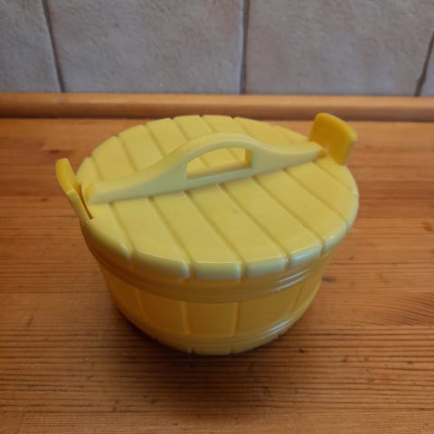 Designet for oppbevaring av smør eller lignende på kjøkkenet.