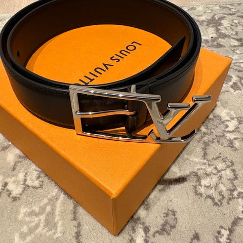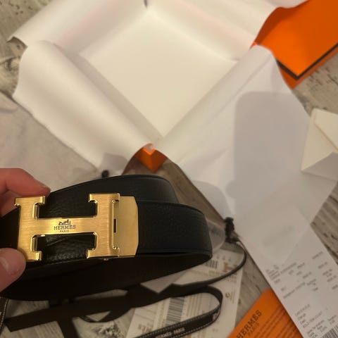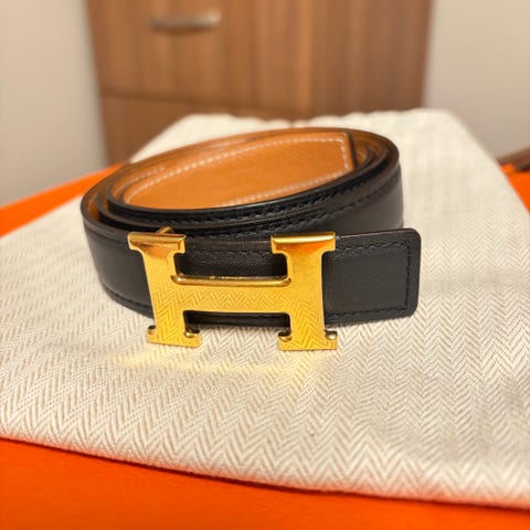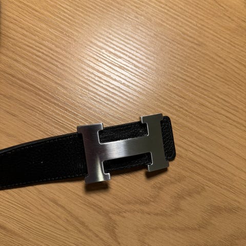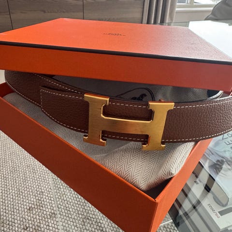 Hermès unisex belte i brun skinn med sølvfarget spenne formet som bokstaven H. Belte har flere hull for justering av størrelse og er 100cm lang, men er størrelse 85 (som er printet i læret) . Beltet har korrekt blindstempel (P i firkant, 2012), printet “Hermès Paris Made in France” i læret, samt original H-spenne med Hermes- og Made in France-merking. Avtakbar spenne og høy kvalitet på skinn og sømmer. Samsvarer fullt med original Hermès-produksjon.