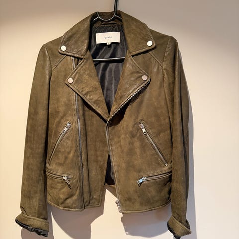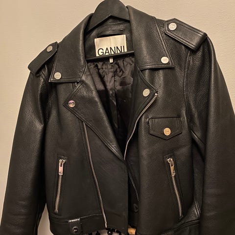 Nydelig skinnjakke fra Ganni selges da den dessverre blir for lite brukt. Veldig solid i 100 % kuskinn med detaljer i semsket skinn. Normal i str. og vil si den passer fint både til M og S.