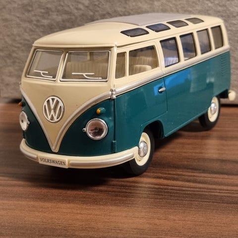 Volkswagen T1 minibuss lekebil i grønn farge med hvit kajak på taket. Modellen har detaljerte vinduer og dekorative trykk på sidene. Egnet som samleobjekt eller leketøy.
