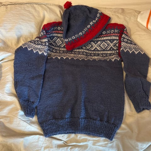 Hjemmestrikket mariusgenser i lys blå og hvit. Aldri brukt. Passer til 2-4 år.