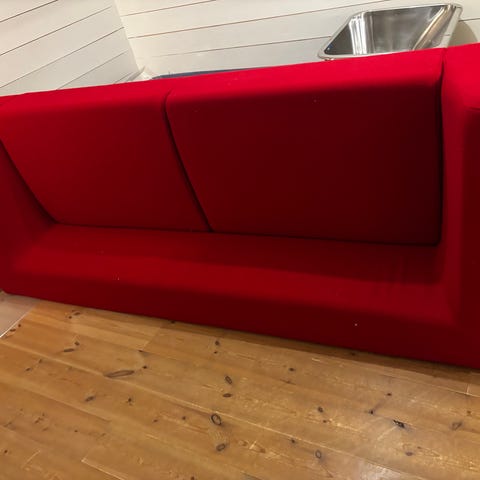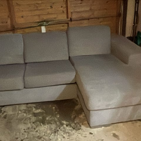 Ingen synlig slitasje i skinnet og den er i god stand. Litt revnet trekk under sofaen.