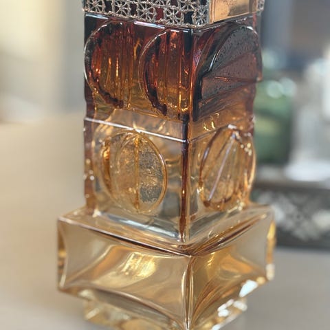 Nydelig glasskunst fra Finland, feilfri og håndsignert under med Pentti Sarpaneva - Oy Kumela. Uvanlig farge. Alle sider er ulike. Øvre kant har et bånd av bronse eller messing. Gammel etikett Turun Hopea Made in Finland. Høyde 8 cm, og måler ca 8*8 cm.