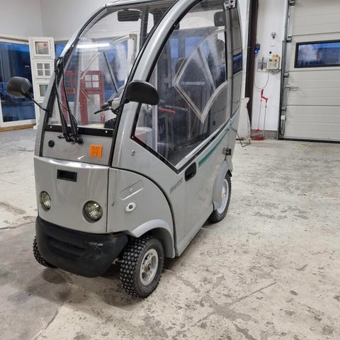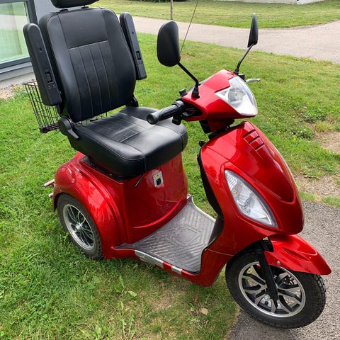 Blå, elektrisk scooter med 4 hjul. Selger denne fordi jeg har fått mobilitetsskuter gjennom hjelpemiddelsentralen.