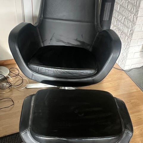Sett med to svarte hvilestoler i skinn med tilhørende fotstøtter. Stolene har treunderstell og polstrede armlener, designet for komfort og avslapning. Pris høyesbydende over 1 000 kr pr. stk. Bør hentes.