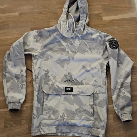Dope jakke i størrelse S for menn. Jakken har et mønster i rødt, hvitt og svart med en hette og justerbare mansjetter. Egnet for ulike utendørsaktiviteter. Er pent brukt.