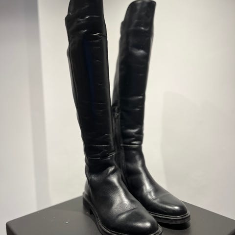 Lekre svarte høge skinnstøvletter Stockholm; str.39 med stretch bakside somnlagar fin siluett og gjer at støvletten sitt pent. Kan og brettast litt ned øverst.