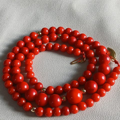 Helt nytt halskjede av naturlig stillehavskorall (Corallium rubrum). Avstandperler er 18k gullbelagt. Låsen er 14k gull fyllet fjærlås. Leveres med gaveeske. Info om størrelse vises på bildene. For spørsmål skriv melding.