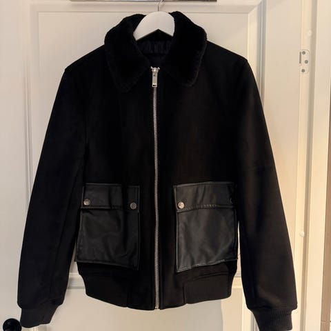 River Island jakke i semsket skinn i brun farge, størrelse L for menn. Jakken har en glatt innsiden med quiltet foring og glidelåslommer. Materialet er semsket skinn, og plagget er designet for utendørs bruk.