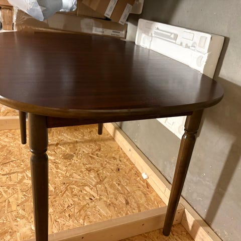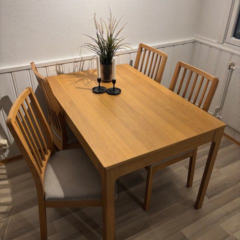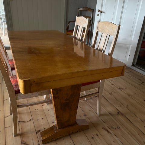 Lite bord med to stoler. Passer til en liten kjøkkenkrok. Antagelig minst 100 år gammelt. Må hentes. Sendes ikke.
