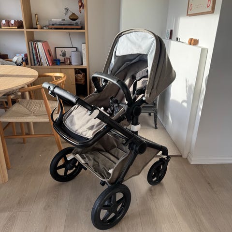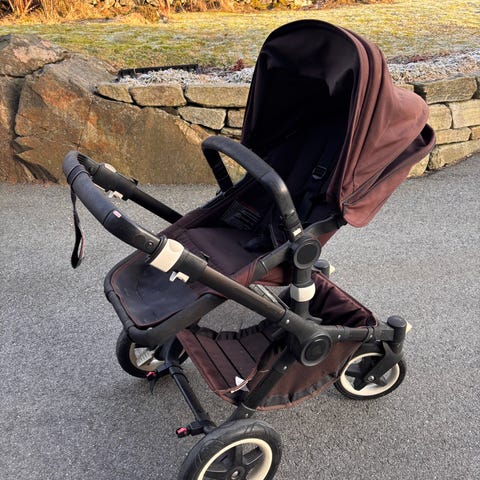 Bugaboo barnevogn, med søskenbrett og to typer soveposer.