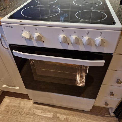 Electrolux stekeovn med induksjonstopp. Komfyren har fire kokeplater og hvit farge. Touch system på platene og to vri knotter til stekeovnen. Stekeovnen har flere funksjoner: varmluft, grill, over/under og noen fler jeg ikke vet hva er:) Maks grader på stekeovn: 250.