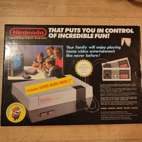Selger en Super Set Nintendo 8bit komplett i eske med fin isopor, manual, 4 originale håndkontrollere, 4 score multiplayer, original strømforsyning, RF kabel og 3 spill i ett som inneholder: