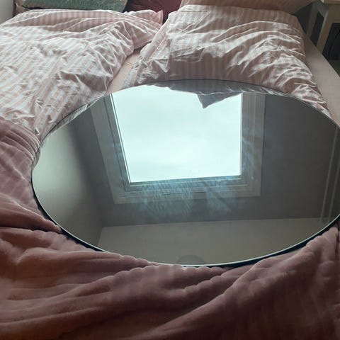 Rundt speil med svart ramme. Speilet har en enkel og moderne design som passer til ulike rom og innredningsstiler.