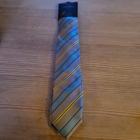 Farge: grått, hvite striper på den smaleste delen, skjules av skjortekrage.