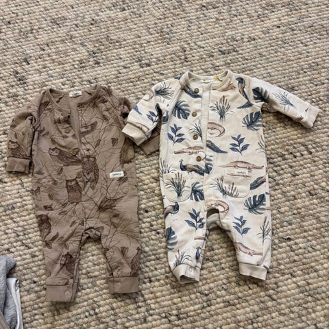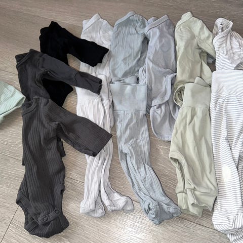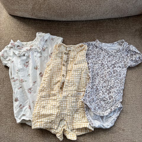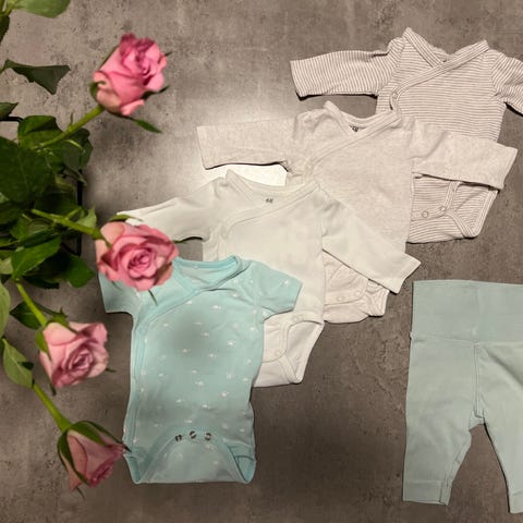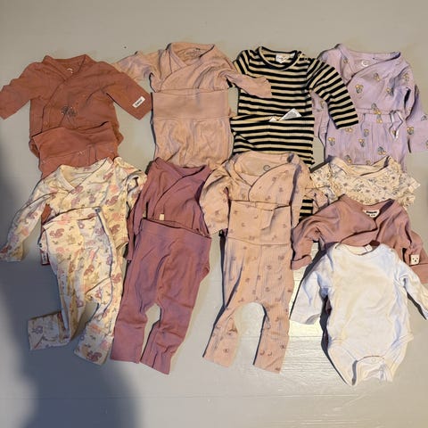 Selger 6 omslagsbodyer og 6 bukser i strl 50. Merker er Newbie, HM, Next og Petit Bateau.