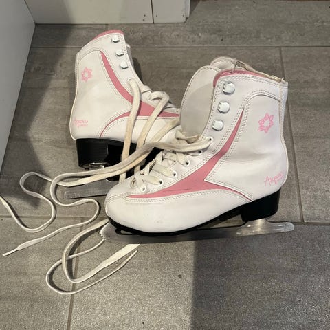 Barn skøyter størrelse 27 i rosa farge med hvit pelskant rundt ankel. Skøytene har lisser og hvite knapper for feste. Egnet for barn og til bruk på isbaner eller utendørs skøyteområder.