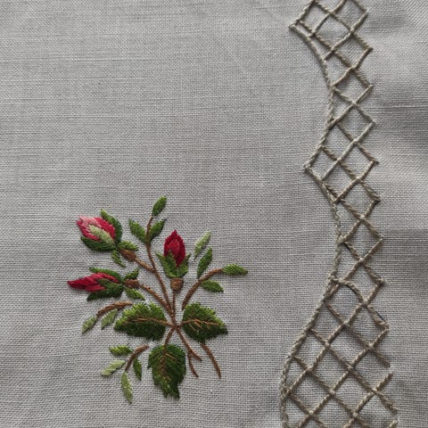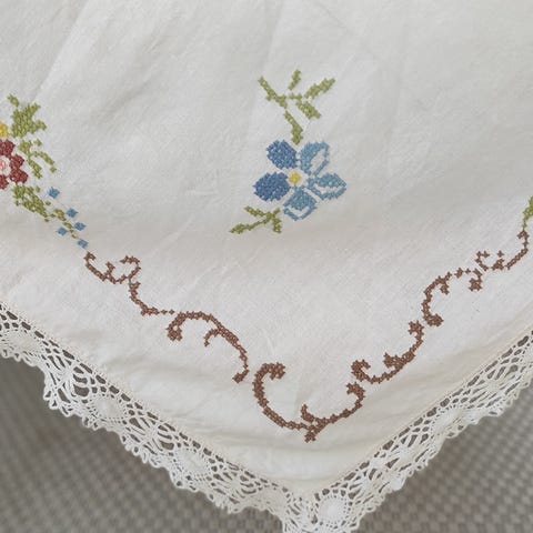 Liten håndbrodert bordduk, 80/ 80 cm.