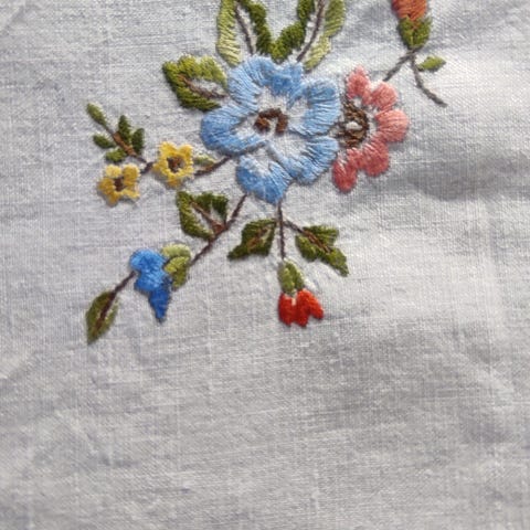 Liten håndbrodert duk med vakre fargerike broderier. Ingen flekker eller tegn av bruk.