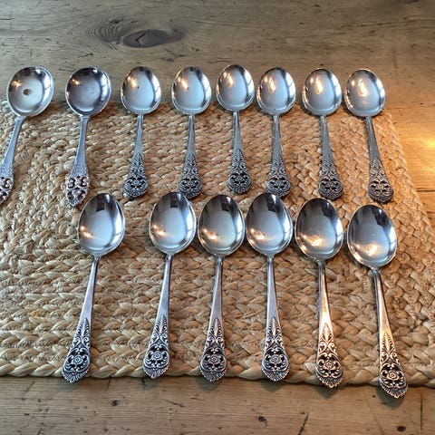 6 stk Finse spiseskjeder med en lengde på 19 cm hver. Skjeene har et dekorativt mønster på håndtaket og er laget av sølvplett Egnet til samling eller bruk ved servering.