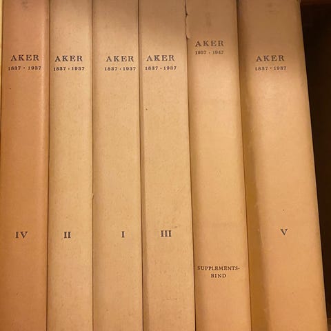 Akers histore. Ved Dr. Edv. Bull. Kristiania Olav Norlis Forlag. 1918. 504 sider. Pluss 5 ekstrasider. Pent brukt, litt slitte kanter på permene, men virkelig pent brukt til å være over 100 år gammel. . Penest innvendig.