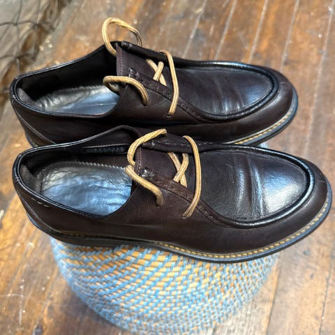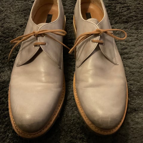 Kjøpt helt nye i 2017. Brukt av en voksen og kun innendørs på kontor. Veldig bra farge og gode å gå i. Har ikke fått service og har heller ikke behov for det. Kan bruke et lag med skogstur for å få fargen enda mer definert. Fargen er petroleum/lys blå-grønn