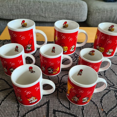 Selger 3 stk keramikkopper med matchende fat. Grå med søtt reinsdyrmotiv – perfekt til jul, kaffe eller kakao. Lite brukt og i veldig god stand.