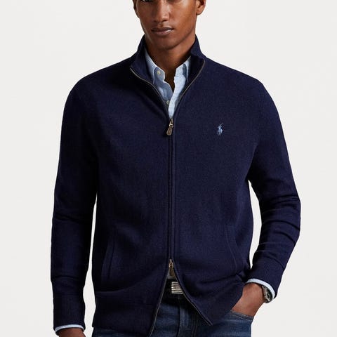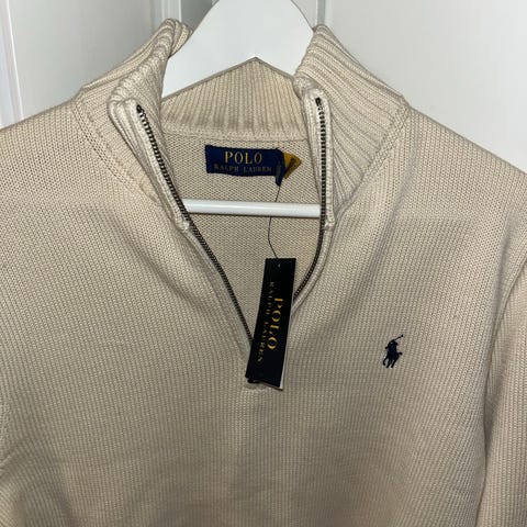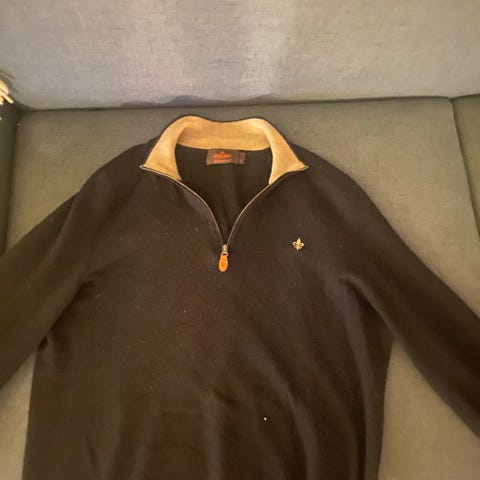 Selger brukt genser i marineblå fra kvalitetsmerket MORRIS.