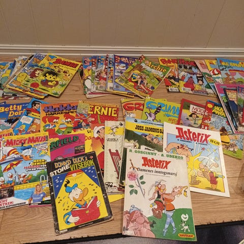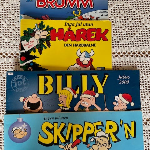 Robin Hood (1975), Ole Brumm (2001), Dennis (1978, 1987), Garfield (1987), Helan og Halvan (1978, 1980). Kan hentes på Geilo. Kan sendes fiks ferdig. Kan leveres fraktfritt til Kongsberg eller Harestua ved anledning.