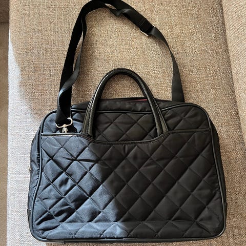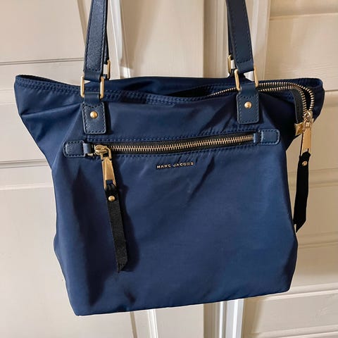 Vesken er kjøpt i London, brukt en gang. Materialet er i nylon, glidelås i "sølv" og fargen er Navy. Det er to lommer på utsiden ( en med glidelås og en uten ) og fire lommer på innsiden ( en med glidelås ) Størrelse på vesken: 25 × 25 cm.