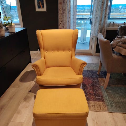 Hei, ønsker å selge en veldig fin gul stol jeg har, på grunn av lite plass! Den ser nærmest ubrukt ut, og er veldig komfortabel å sitte i. Send over en melding hvis du er interessert 😄