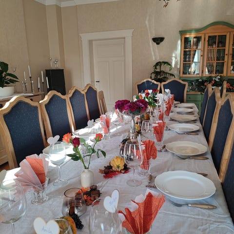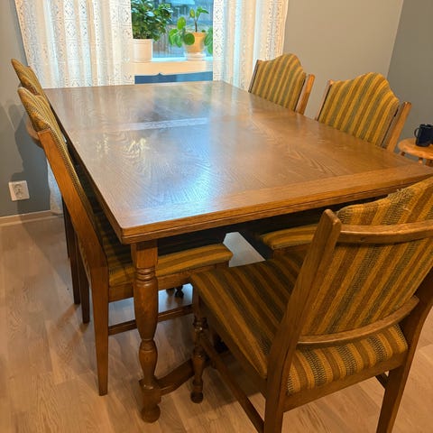 Heltre eik. B 100 cm × L 200 cm H 76, 1 ileggsplate 50 cm, 8 stoler.