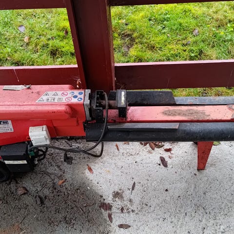 Dovre Vedkappsag elektrisk vedkappsag for kapping av ved. Produktet har en robust konstruksjon med rødt metallramme og motor. Egnet for effektiv og sikker vedkapping.