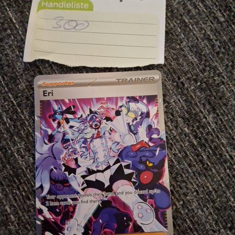 Trainer Eri Pokémon-kort med illustrasjon av karakteren Eri og flere Pokémon i bakgrunnen. Kortet brukes i Pokémon-kortspillet. Og det er rett ut av pakken.