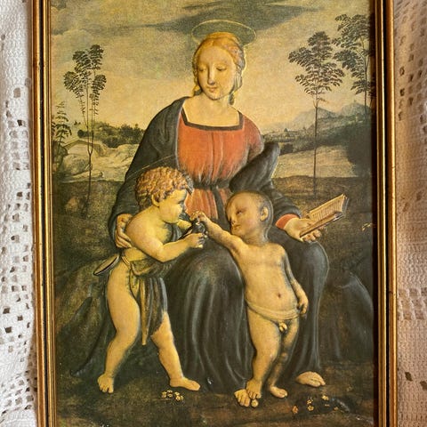 Selger en innrammet plakat av motivet Bergen 1580 (scholeusstikket), det første kjente prospektet av Bergen.