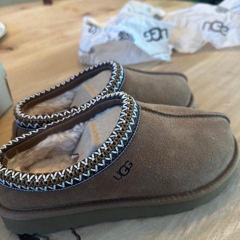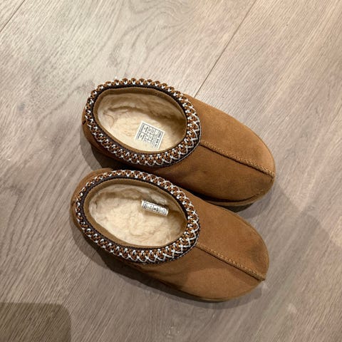 Skoene har en brun farge og er foret med mykt, lyst materiale for komfort og varme.