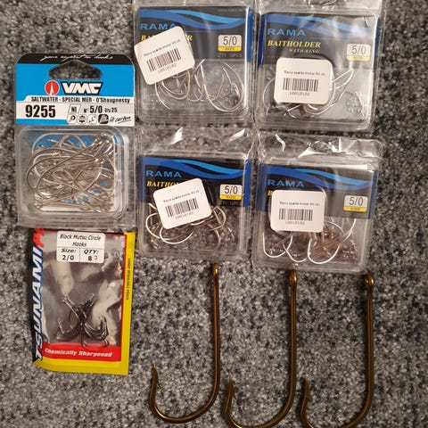 Selger samlet 9 nye pakker med kvalitetskroker fra Mustad og Owner i krokstørrelsene 2/0 og 3/0. Det er 4 pakker Mustad Baitholder 3164e i størrelse 2/0, 2 pakker Mustad Big Gun 10841NP i størrelse 2/0 og 3/0 og 3 pakker Owner SSW Red Finish i størrelse 2/0 og 3/0.