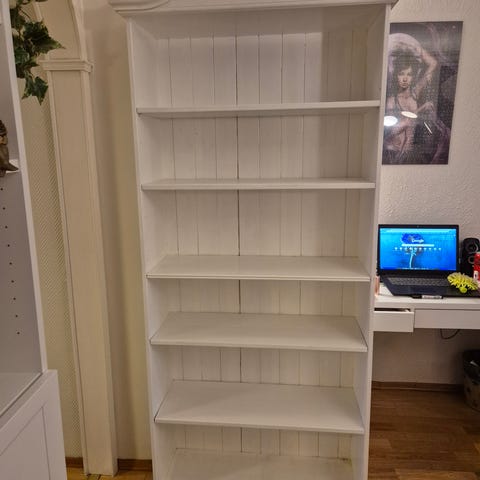 2 stk. Oppbevaringshyller med fire hylleplan hyllene er laget av furu og egner seg som en lettere lagerhylle, kan monteres med flere hyller. Enkel å flytte. Pris kr 700 for begge ellers kr 400 for en, de er demontert er klært for henting.