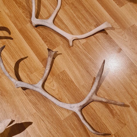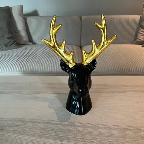 Den stående hjorten har et lite sort merke på baklåret, og den liggende hjorten har en liten skade på det ene hornet. Ellers er de som ny :)