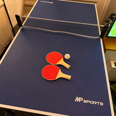 Bordfotballspill med blått og svart design. Spillet har spillere i rødt og blått, og inkluderer stenger for å styre spillerne. Egnet for innendørs bruk.