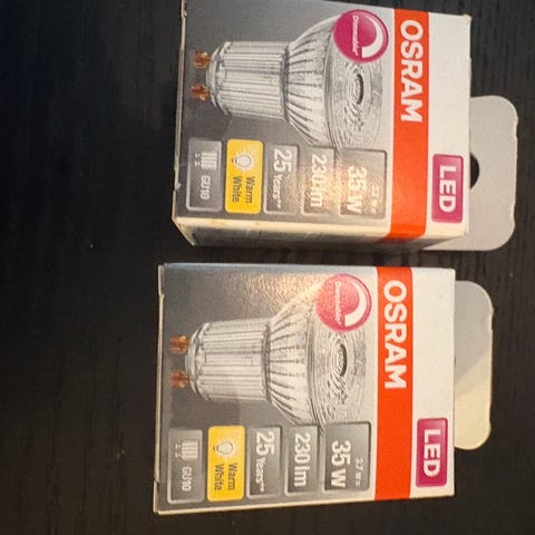 Selger 5 stk Osram dimbare warm white LED-spoter med GU10-sokkel. Fungerer helt fint, selges pga nytt lyssystem.