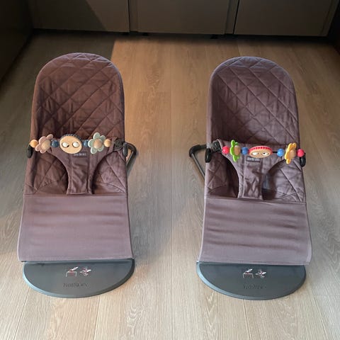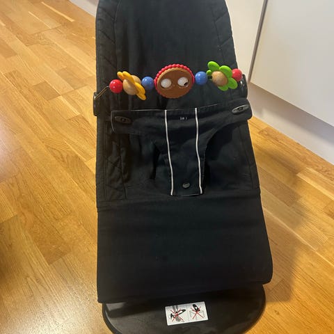 Babybjörn barnestol i grå farge. Inkluderer en lekeaktivitet med fargerike blomster og en figur. Har vasket stoffet et par ganger som vises på bruken ellers er stolen hel og fin.