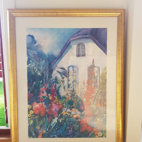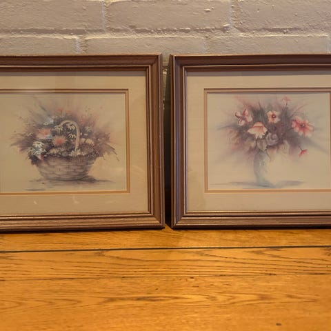 Original kunstverk med blomstermotiv i svart, hvitt og rødt. Bildet er innrammet med en svart ramme og har en beige passepartout. Passer til dekorasjon i hjem eller kontor.
