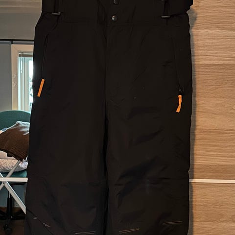 2 stk thermobukse (herre, men passer godt til dame også). Fascinerende gode og varme bukser (føles som å gå i en deilig dyne😄). Har aldri blitt kald i disse, selv å sitte i ro i mange minusgrader går fint. Er pittelitt slitt på knærne, og det er noe farge på den ene som ikke går vekk i vask (se bilde), ellers i fin stand. Vannavvisende, refleks og snølås i benavslutningene.