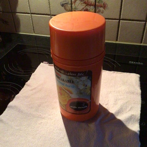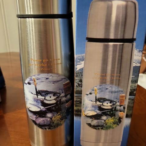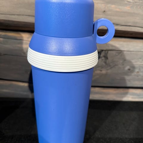 Stor termos i retrostil med pen dekor. Med hank og kopp. Dekorativ.