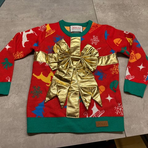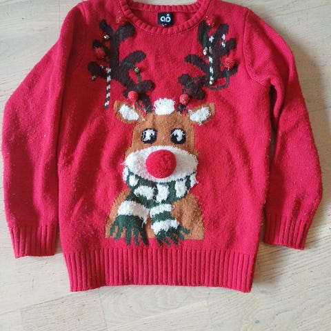Julegenser fra George kjøpt i London, str. 11-12 år. Dusken på nisseluen blinker i lys i forskjellige farger ved bevegelse.