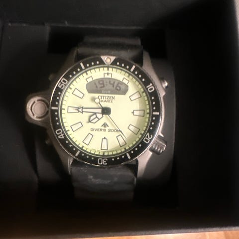 Citizen Promaster dykkerur med svart urskive og gummirem. Klokken har tydelige markeringer og roterende bezel for dykking. Batteritype er litium med nylig batteribytte og trykktest utført.