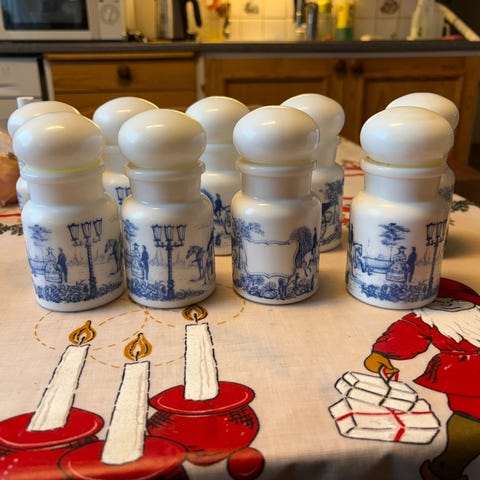 Hver krukke merket : Muskat, Laubær, Karry, Estragon og Bakepulver. Den store krukken er merket mel.